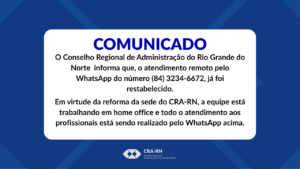 CARTEIRA DIGITAL AUTOATENDIMENTO ANUIDADE | PAGAMENTO Últimas Notícias CRA-RN marca presença em colação de grau da UniCatólica RN A representante da subseccional Mossoró, do Conselho Regional de Administração do Rio Grande do Norte (CRA-RN), Adm. Cíntia Câmara, participou ...Leia Mais CRA-RN realiza primeira edição do Desenvolve ADM 2026 com foco em Inteligência Artificial e Processos O Conselho Regional de Administração do Rio Grande do Norte (CRA-RN) realizou, nesta quarta-feira (28/01), a primeira edição do ...Leia Mais CRA-RN restabelece acesso remoto pelo WhatsApp 3234-6672 O Conselho Regional de Administração do Rio Grande do Norte informa que, o atendimento remoto pelo WhatsApp do número (84) ...Leia Mais Presidente do CRA-RN participa de colação de grau da UNI-RN O presidente do Conselho Regional de Administração do Rio Grande do Norte (CRA-RN), Adm. Flávio Emílio Cavalcanti, participou, na tarde ...Leia Mais Reforma da sede do CRA-RN avança para nova fase As obras de modernização da sede do Conselho Regional de Administração do Rio Grande do Norte (CRA-RN) seguem em ritmo ...Leia Mais Desenvolve ADM discute a Inteligência Artificial e processos A sua gestão está preparada para a era da Inteligência Artificial? Mais do que tecnologia, é sobre repensar processos, decisões ...Leia Mais 1 2 3 … 128 › Cursos ON-LINE Calendário de Eventos Últimas Publicações Confira outras publicações