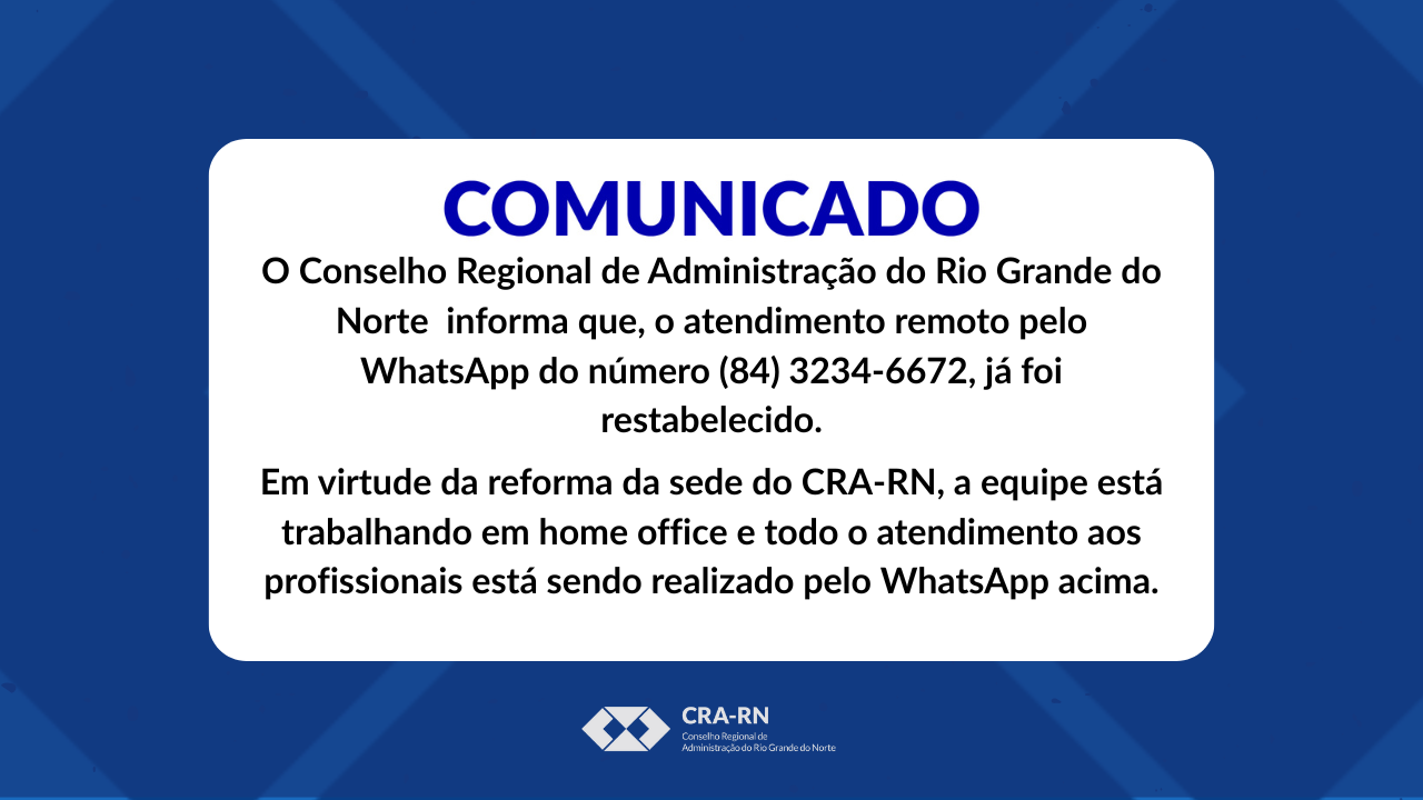 O Conselho Regional de Administração do Rio Grande do Norte informa que, o atendimento remoto pelo WhatsApp do número (84) 3234-6672, já foi restabelecido.